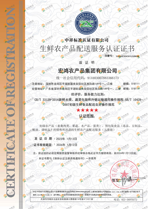 “生鮮農(nóng)產(chǎn)品配送服務(wù)五星級(jí)認(rèn)證證書”